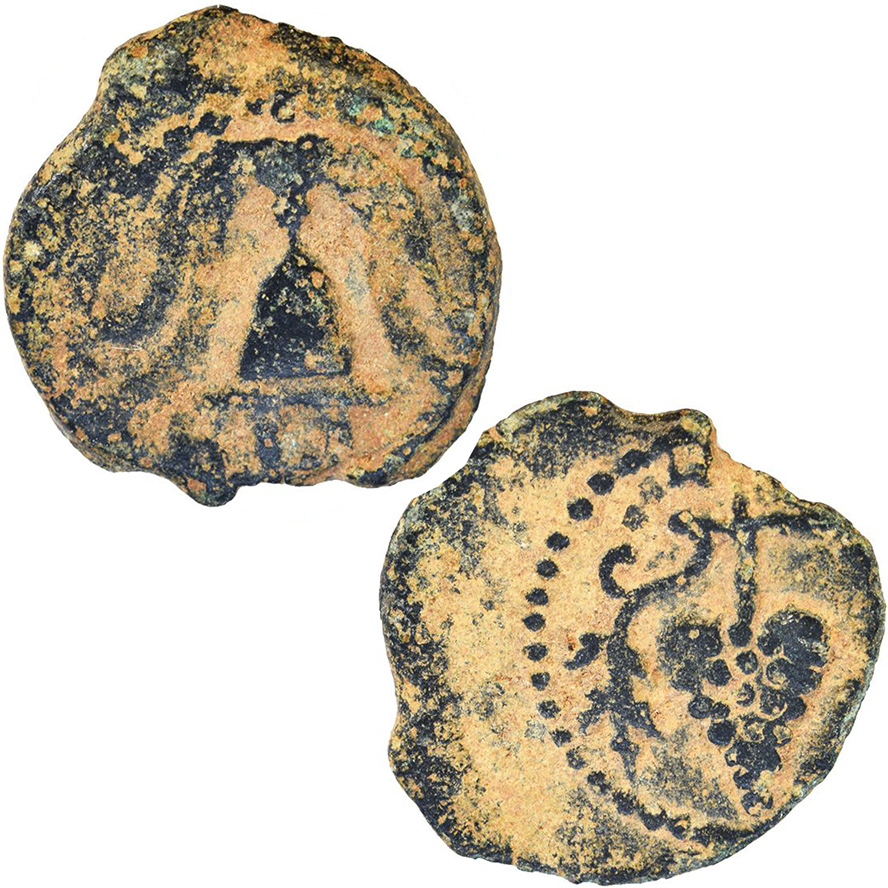 Struck in Jerusalem between 4 BC and 6 AD, this coin features a grape cluster on one side and a military helmet on the other. It arrives with an elegant display stand, official certificate, and IAA documentation.