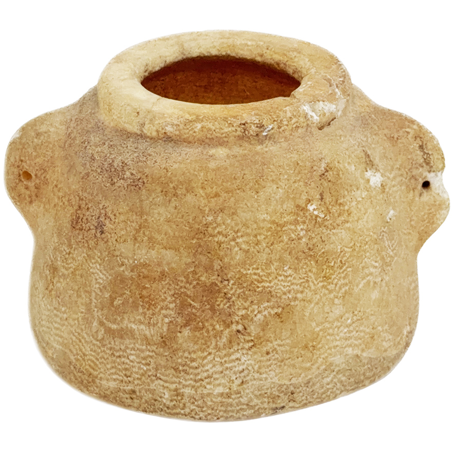 Its two handles contain small holes so owners could suspend the jar with cord. Standing 3 inches tall, the piece remains in good condition despite a minor chip on one handle. Collectors, historians, and Bible teachers value its historical importance.